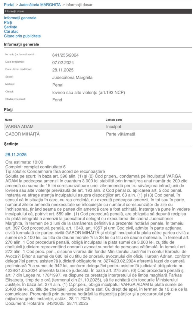 Judecătoria Marghita a condamnat, la finalul lunii noiembrie 2025, un bărbat din Săcueni, Varga Adam, la o amendă penală de 3.000 de lei, pentru lovirea unui localnic. Decizia vine după patru ani de la incidentul care a declanșat dosarul penal.