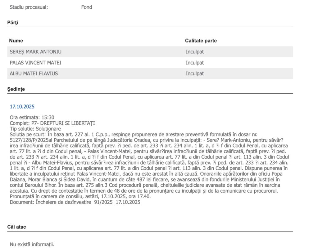 În ședința din 17 octombrie 2025, completul P7 – Drepturi și Libertăți de la Judecătoria Oradea a decis, în baza art. 227 alin. (1) din Codul de procedură penală, să respingă propunerea de arestare formulată de Parchet.