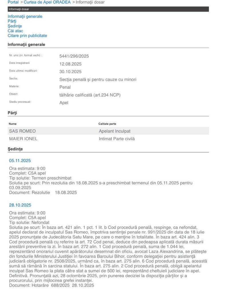 Sas Romeo a declarat apel, cerând suspendarea pedepsei și reducerea despăgubirilor, însă Curtea de Apel Oradea a considerat cererea nefondată.
