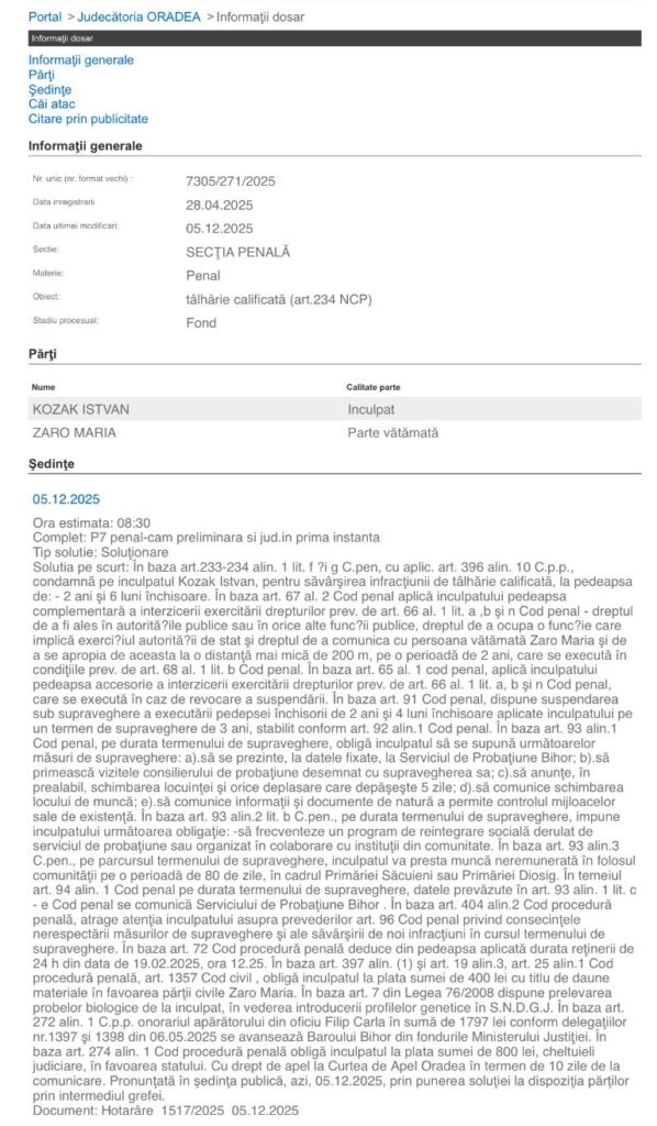 Judecătoria Bihor a pronunțat, în 5 decembrie 2025, sentința într-un caz de tâlhărie calificată care a vizat o femeie de 85 de ani. Inculpatul, Kozak Istvan, a fost găsit vinovat pentru pătrunderea fără drept în curtea victimei, furtul a două telefoane mobile și agresarea acesteia, însă nu va executa pedeapsa în penitenciar, întrucât instanța a dispus suspendarea sub supraveghere.