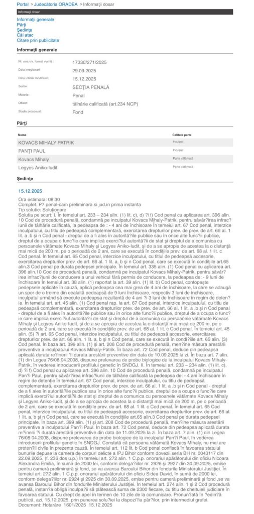 Judecătoria Bihor a pronunțat, la data de 15 decembrie 2025, o sentință severă într-un dosar de tâlhărie calificată și conducere fără permis, fapte comise cu un grad ridicat de violență într-o locuință din comuna Oșorhei. Doi tineri, Kovacs Mihaly-Patrik și Panți Paul, au fost condamnați la pedepse cu executare în regim de detenție, instanța reținând pericolul social ridicat al faptelor și circumstanțele deosebit de grave în care acestea au fost comise.