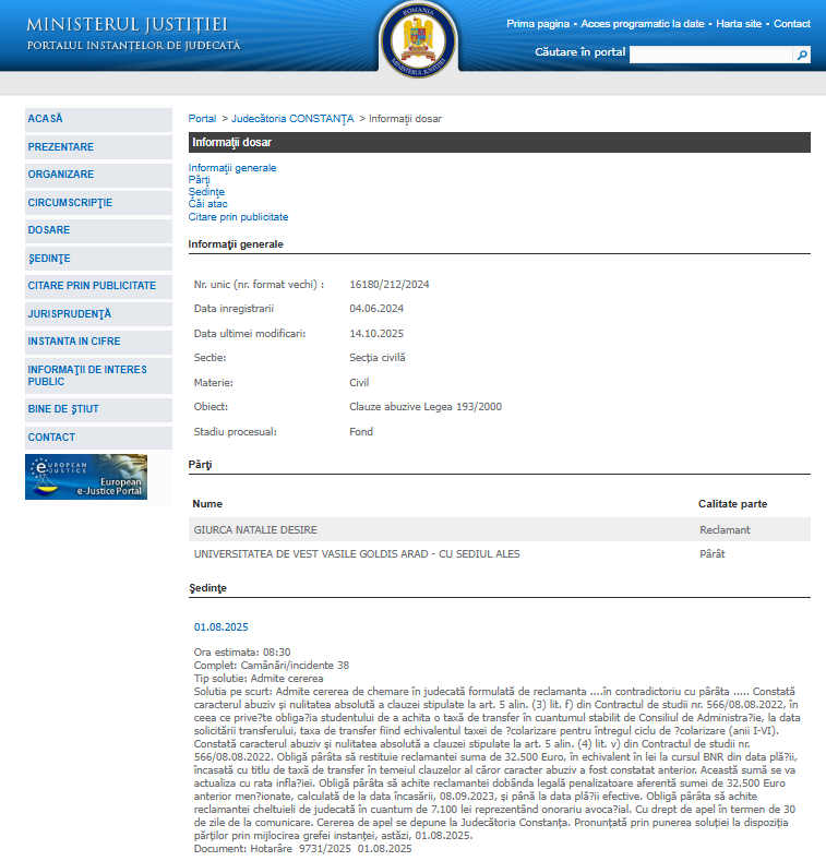 Judecătoria Constanța a admis acțiunea formulată de o studentă la Facultatea de Medicină împotriva Universității de Vest „Vasile Goldiș” din Arad, dispunând restituirea integrală a sumei de 32.000 de euro, reprezentând taxa solicitată de instituție pentru aprobarea unui transfer către o altă universitate, așa cum relatează sursa citată Ziua de Constanța.