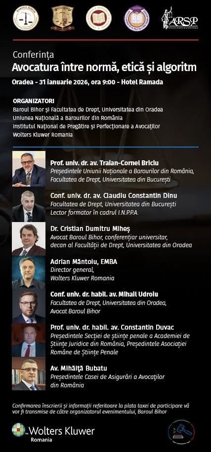 Evenimentul, organizat prin efortul comun al Baroului Bihor, Facultății de Drept din cadrul Universității din Oradea, UNBR, I.N.P.P.A. și Wolters Kluwer România, își propune să exploreze linia fină dintre rigoarea normativă tradițională și eficiența oferită de noile tehnologii.
