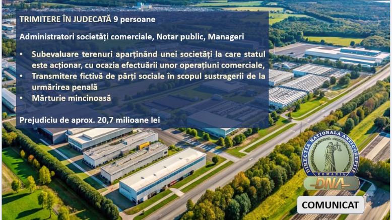 DNA – Serviciul Teritorial Alba Iulia a trimis în judecată opt inculpați, între care administratori, un project manager și un notar public, într-un amplu dosar privind vânzarea la prețuri subevaluate a unor terenuri aparținând S.C. Parc Industrial Sibiu S.A., societate la care UAT Șelimbăr este acționar.