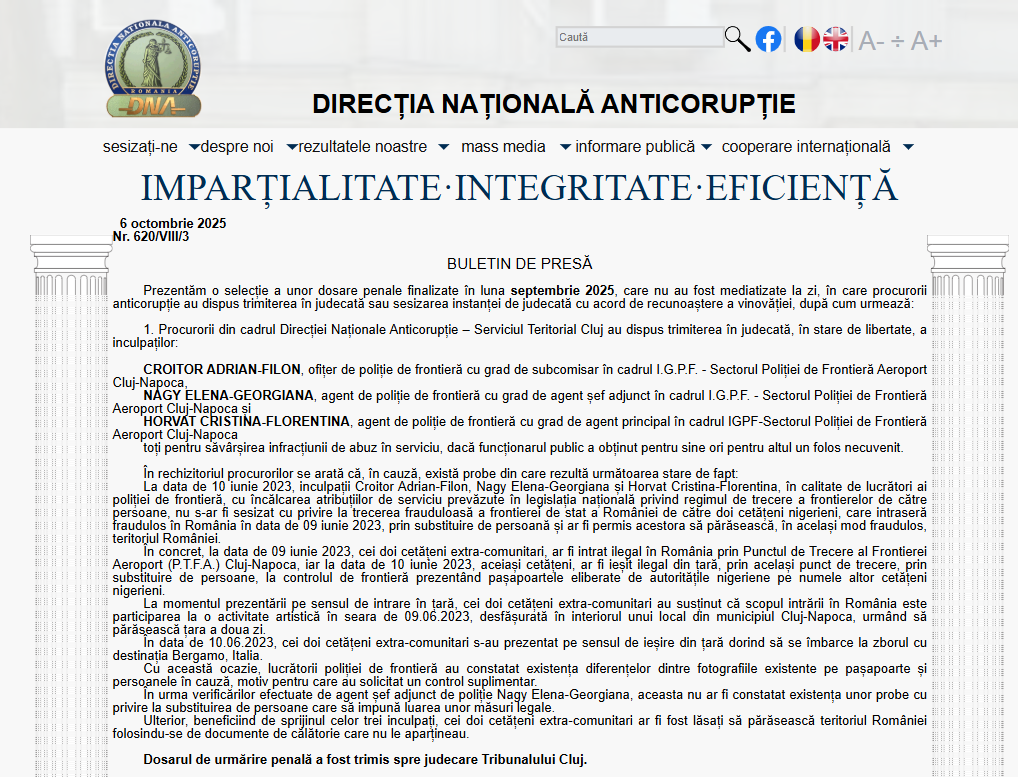 Direcția Națională Anticorupție – Serviciul Teritorial Cluj a dispus trimiterea în judecată a trei lucrători ai Poliției de Frontieră de la Aeroportul Cluj-Napoca – subcomisarul Croitor Adrian-Filon, agentul șef adjunct Nagy Elena-Georgiana și agentul principal Horvat Cristina-Florentina – pentru abuz în serviciu, după ce ar fi permis trecerea frauduloasă a frontierei de stat de către doi cetățeni nigerieni.