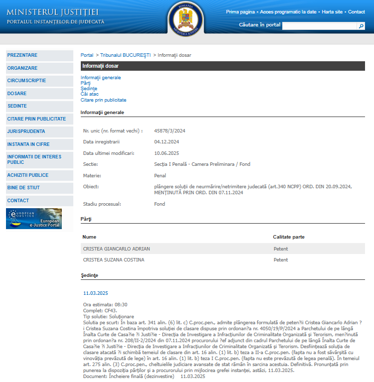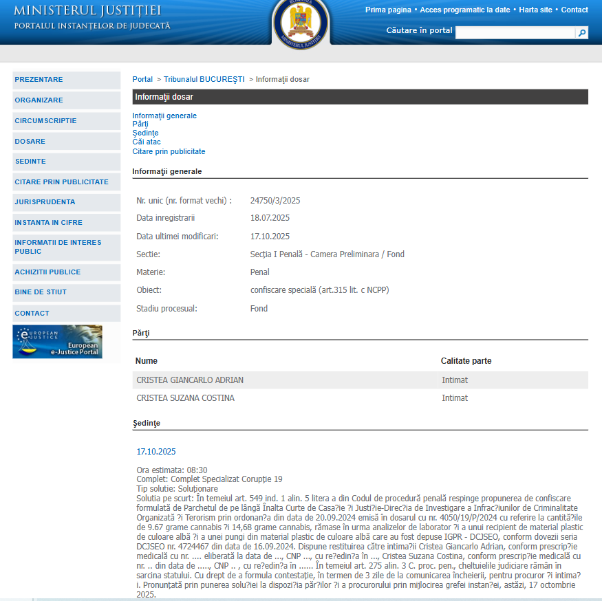 Tribunalul București a respins vineri, 17 octombrie 2025, propunerea de confiscare formulată de DIICOT și a dispus restituirea cantităților de canabis medicinal confiscate anul trecut de pe Aeroportul Internațional Henri Coandă, soților Giancarlo și Suzana Cristea, români stabiliți în Marea Britanie, conform sursei citate HotNews.