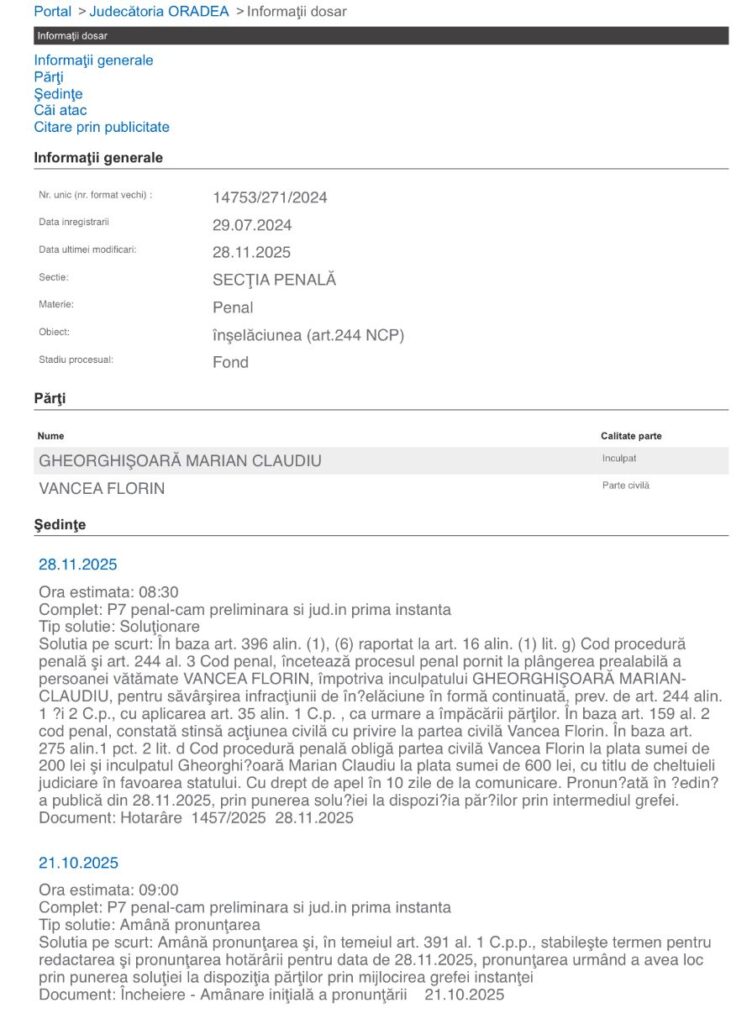 La Judecătoria Oradea a fost soluționat un caz neobișnuit de înșelăciune, în care un bărbat a reușit, timp de peste un an, să își păcălească un apropiat folosindu-se de o identitate falsă. Procesul penal a fost însă închis după ce cei doi s-au împăcat.