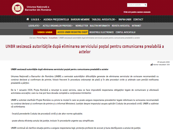 ” Uniunea Națională a Barourilor din România (UNBR) a semnalat autorităților dificultățile generate de eliminarea serviciului de scrisoare recomandată cu conținut declarat și confirmare de primire, folosit frecvent în procedura ordonanței de plată și în alte proceduri civile și arbitrale care prevăd notificarea prealabilă a părților.
