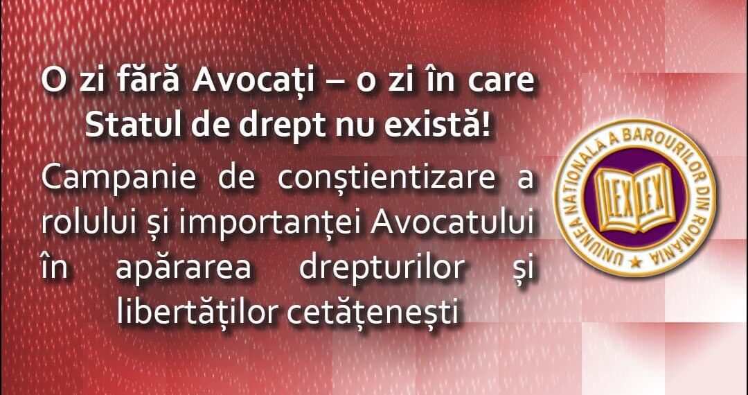 Consiliul Uniunii Naționale a Barourilor din România a hotărât organizarea campaniei “O zi fără Avocați -o zi în care Statul de drept nu există!” pentru apărarea drepturilor avocaților și implicit ale justițiabililor, cu scopul conștientizării rolului profesiei de avocat și a profesioniștilor avocați în viața socială a Statului, a societății Civile și a sistemului judiciar.