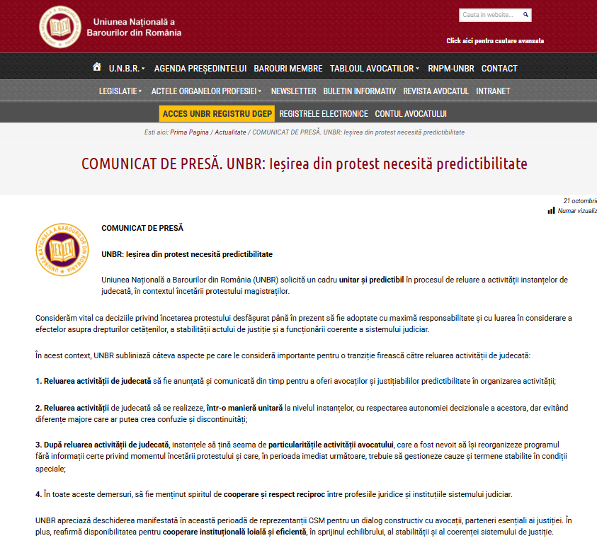 Redăm integral comunicatul de presă al UNBR, remis publicității azi 21 octombrie: