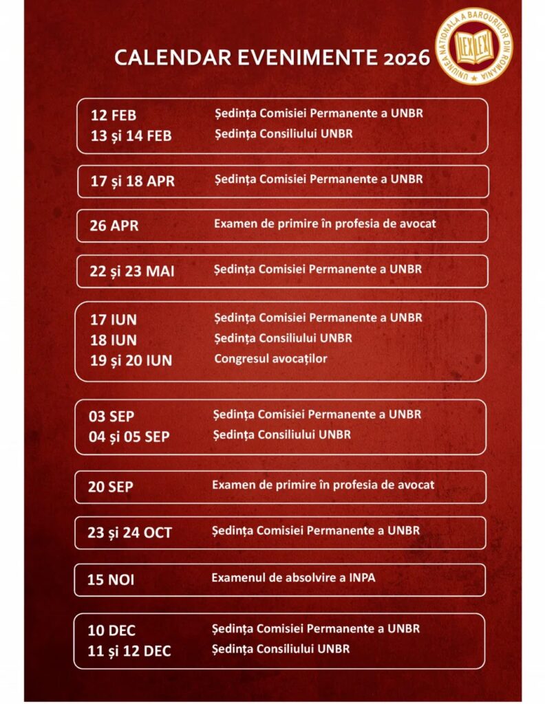 Uniunea Națională a Barourilor din România (UNBR) a aprobat calendarul examenelor și al principalelor activități profesionale pentru anul 2026, în cadrul ședinței Consiliului UNBR desfășurate în perioada 12–13 decembrie 2025. Decizia vine în urma analizării programului de activitate al organelor de conducere ale profesiei, având ca obiectiv crearea unui cadru organizatoric coerent, predictibil și transparent la nivel național.