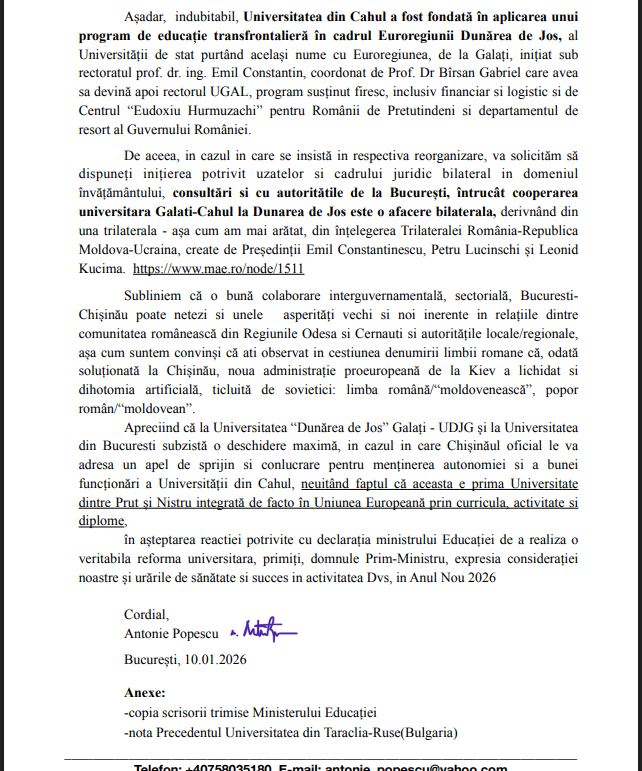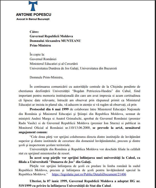 Publicăm scrisoarea transmisă de avocatul Antonie Popescu, din Baroul București, către Guvernul Republicii Moldova, document în care sunt invocate angajamentele bilaterale și cadrul juridic internațional ce stau la baza înființării și funcționării Universității din Cahul.