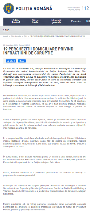 La data de 25 noiembrie a.c., polițiștii Serviciului de Investigare a Criminalității Economice, sub coordonarea procurorului din cadrul Parchetului de pe lângă Tribunalul Satu Mare, au desfășurat 19 percheziții domiciliare în județ. Acestea vin să întărească suspiciunile privind emiterea contra cost a unor referate medicale, în care se consemnau, în mod nereal, examinări sau diagnostice severe — documente utilizate ulterior pentru obținerea nelegală a pensiei de handicap.