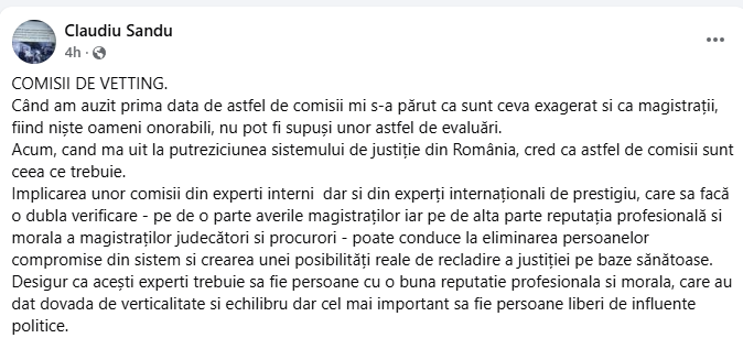 Un comentariu public postat de procurorul CSM Claudiu Sandu pe rețelele de socializare readuce în discuție ideea comisiilor de „vetting” pentru magistrați, formate din experți interni și internaționali, care să verifice atât averile, cât și reputația profesională și morală a judecătorilor și procurorilor. În postarea sa, Sandu afirmă explicit că, deși inițial a considerat aceste comisii exagerate, degradarea sistemului de justiție îl face să creadă că ele ar putea fi „ceea ce trebuie” pentru eliminarea persoanelor compromise și „reclădirea justiției pe baze sănătoase”.